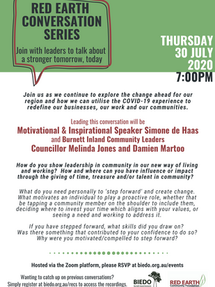 The Red Earth Conversation Series invites you to join with leaders to talk about tomorrow, today. Join us as we explore the change ahead for our region and how we can utilise the COVID-19 experience to redefine our businesses and our work.